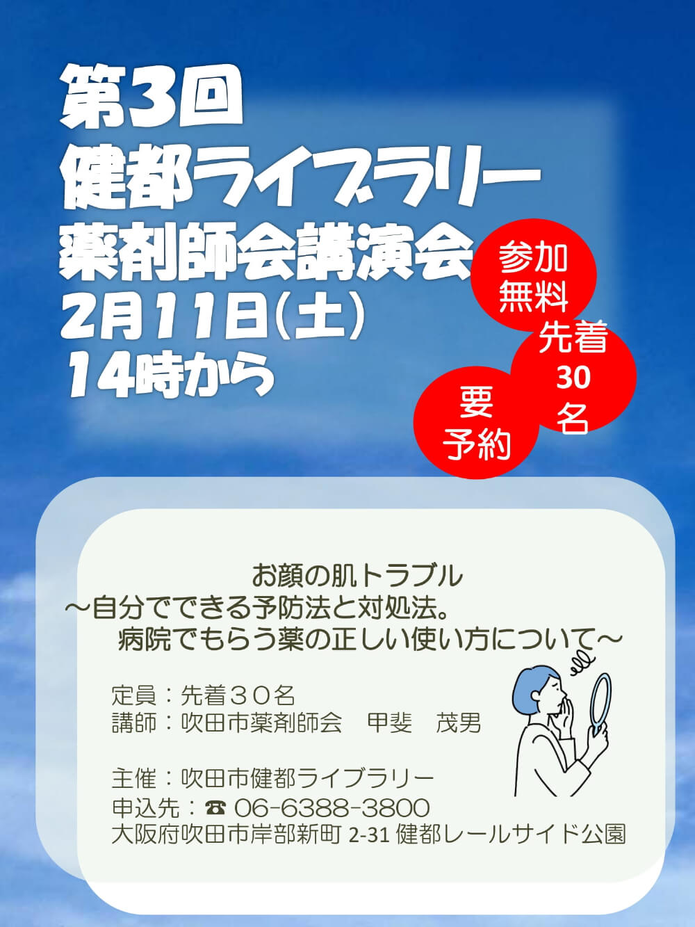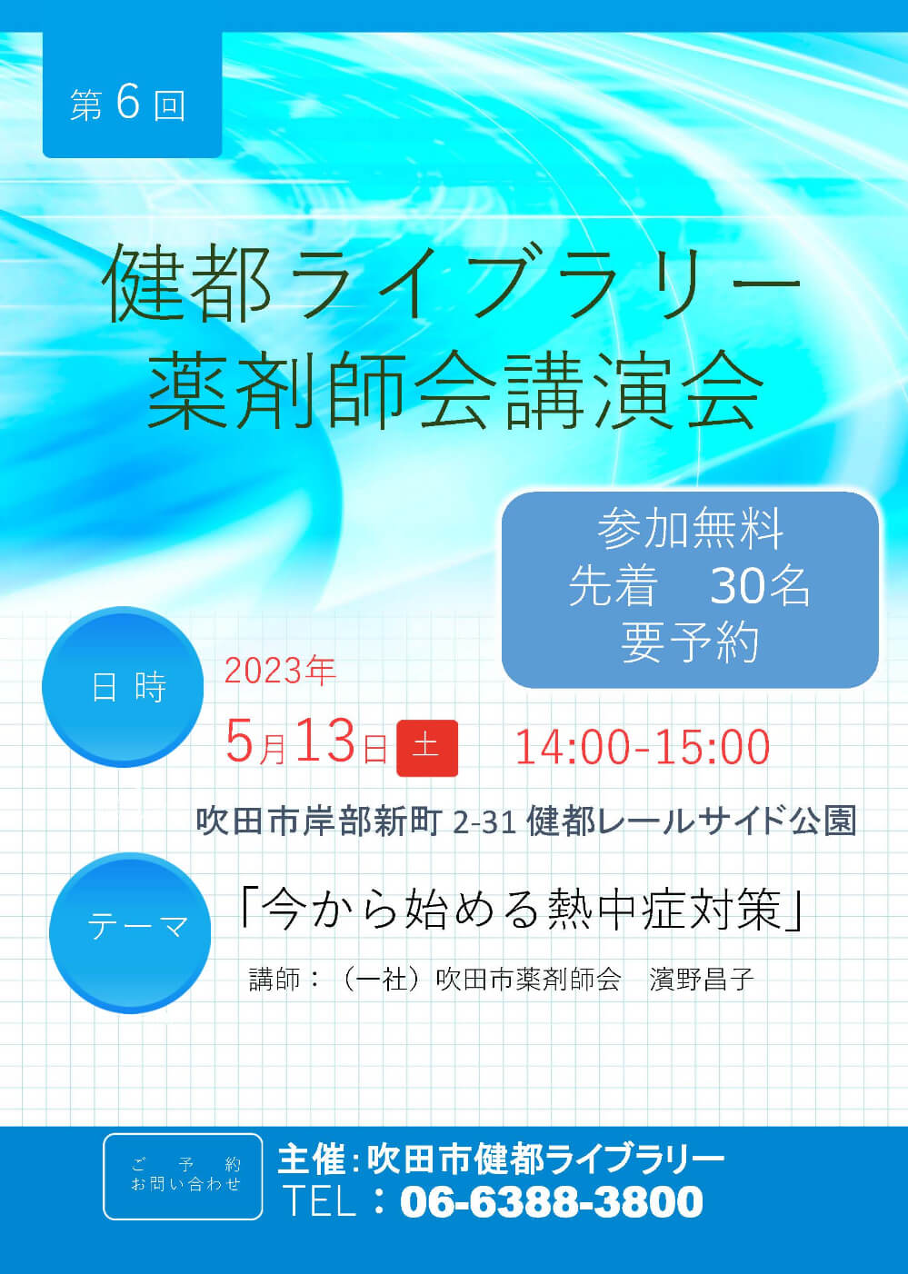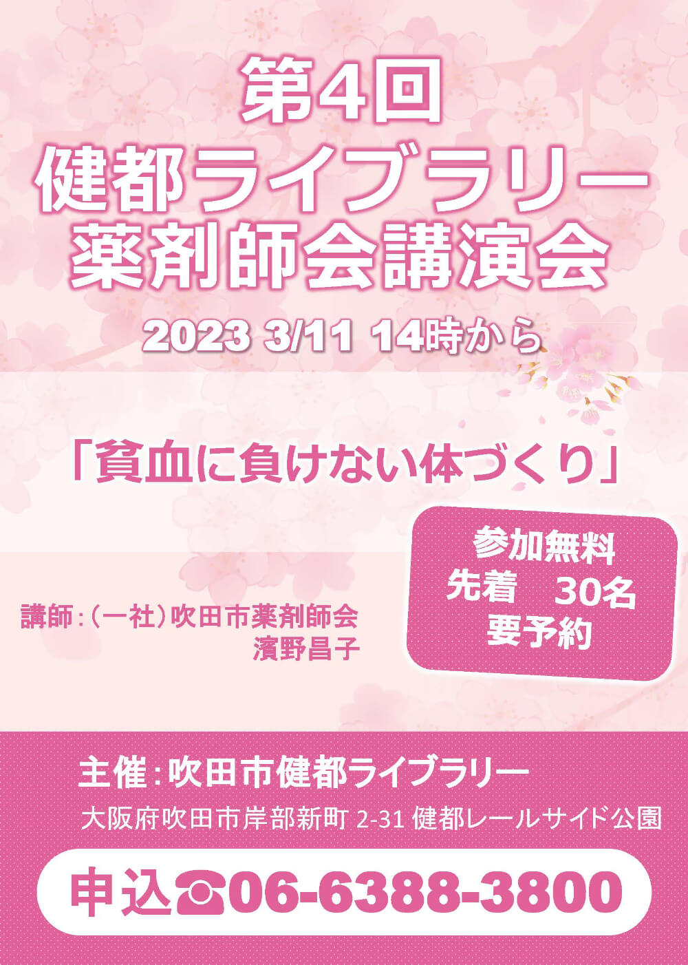 イベント・講座情報 イベントのご案内 お薬出前講座のご案内 イベントのご案内 第30回吹田市薬剤師会ライブラリー講座 日時令和7年 10月11日(土)14:00~15:00 会場健都ライブラリー 概要 「始めてみようアロマテラピー」 第29回吹田市薬剤師会ライブラリー講座 日時令和7年 9月13日(土)14:00~15:00 会場健都ライブラリー 概要 「秋でも要注意!熱中症」 健都ライブラリー講座 日時令和7年 7月26日(土)14:00~16:00 会場健都ライブラリー 概要 「医療のお仕事 発見ワークショップ」 第28回吹田市薬剤師会ライブラリー講座 日時令和7年 6月14日(土)14:00~15:00 会場健都ライブラリー 概要 「食中毒の予防と対策~健康維持のために薬剤師を身近に~」 第26回吹田市薬剤師会ライブラリー講座 日時令和7年 5月10日(土)14:00~15:00 会場健都ライブラリー 概要 「健康食品・サプリメントと薬の飲み方~健康維持のために薬剤師を身近に~」 第26回吹田市薬剤師会ライブラリー講座 日時令和7年 4月12日(土)14:00~15:00 会場健都ライブラリー 概要 「薬の悩み・疑問、解決します!~健康維持のために薬剤師を身近に~」 第25回吹田市薬剤師会ライブラリー講座 日時令和7年 3月8日(土)14:00~15:00 会場健都ライブラリー 概要 「糖尿病について~2型糖尿病治療薬を中心に~」 第11回市民すこやか講演会 日時令和7年 3月29日(土)14:00~15:30 会場千里山コミュニティセンター 多目的ホール 概要 「食事と薬について」 第24回吹田市薬剤師会ライブラリー講座 日時令和7年 2月15日(土)10:30~11:30 会場健都ライブラリー 概要 「ハンドケア講習会」 第23回吹田市薬剤師会ライブラリー講座 日時令和7年 1月11日(土)14:00~15:00 会場健都ライブラリー 概要 「ビタミンの働き~基本的な作用から処方薬まで~」 第22回吹田市薬剤師会ライブラリー講座 日時令和6年 12月14日(土)14:00~15:00 会場健都ライブラリー 概要 「フレイルって何?〜加齢にまけない身体づくり〜」 第21回吹田市薬剤師会ライブラリー講座 日時令和6年 11月9日(土)14:00~15:00 会場健都ライブラリー 概要 「薬局との付き合い方」 第20回吹田市薬剤師会ライブラリー講座 日時令和6年 10月12日(土)14:00~15:00 会場健都ライブラリー 概要 「喉によい漢方」 第19回吹田市薬剤師会ライブラリー講座 日時令和6年9月14日(土)14:00~15:00 会場健都ライブラリー 概要 「歯周病」〜その病気、歯周病が原因かもしれません〜 令和6年度 健都ライブラリー健康医療情報講座 日時令和6年7月27日(土)14:00~16:00 会場健都ライブラリー 概要 「健康と医療のお仕事」 第18回吹田市薬剤師会ライブラリー講座 日時令和6年6月8日(土)14:00~15:00 会場健都ライブラリー 概要 「おうちでかんたん薬膳」〜夏の疲れを残さず秋冬を迎えるために〜 第17回吹田市薬剤師会ライブラリー講座 日時令和6年5月18日(土)14:00~15:00 会場健都ライブラリー 概要 「腰痛症の原因と治療」診療ガイドラインに基づいて、腰痛 の原因を解説し、病院で処方される 主な薬について説明します。 第16回吹田市薬剤師会ライブラリー講座 日時令和6年4月13日(土)14:00~15:00 会場健都ライブラリー 概要 「食事とくすり」腎臓や糖尿病の方の食事、また栄養剤や薬の飲み合わせについてのおはなし 第15回吹田市薬剤師会ライブラリー講座 日時令和6年3月9日(土)14:00~15:00 会場健都ライブラリー 概要 「ニキビとスキンケア」自分でできるスキンケアや最新の治療ガイドラインが学べます。 レディース健康フェスティバル 日時令和6年3月2日(土)10:00~16:00 (雨天延期 3月9日(土)) 会場江坂公園・江坂図書館 概要 女性が美しく健康的に過ごせるために、様々な団体が相談会や体験会などを開催します。またライブや講演会、パフォーマンスなども行います。キッチンカーの出店もあります。 第14回吹田市薬剤師会ライブラリー講座 日時令和6年2月10日(土)14:00~15:00 会場健都ライブラリー 概要 「便秘にきく漢方」 第13 回吹田市薬剤師会ライブラリー講座 日時令和6年1月13日(土)14:00~15:00 会場健都ライブラリー 概要 「ハンドクリーム作り」 令和5年度 みんなの健康展 日時令和5年9月9日(土)13:00~17:00令和5年9月10日(日)9:30~16:00 会場メイシアター 概要 「コツコツ(骨々)続けて、いきいき元気!」 令和5年度 健都ライブラリー健康医療情報講座 日時令和5年7月22日(土)14:00~15:30 会場健都ライブラリー2階多目的室 概要 「令和5年度 健都ライブラリー健康医療情報講座」 第7回健都ライブラリー薬剤師会講演会 日時令和5年6月10日(土)14:00~ 会場健都レールサイド公園 概要 「第7回健都ライブラリー薬剤師会講演会 」 第6回健都ライブラリー薬剤師会講演会 日時令和5年5月13日(土)14:00~ 会場健都レールサイド公園 概要 「第6回健都ライブラリー薬剤師会講演会 」 第5回健都ライブラリー薬剤師会講演会 日時令和5年4月8日(土)14:00~ 会場健都レールサイド公園 概要 「第5回健都ライブラリー薬剤師会講演会 」 第4回健都ライブラリー薬剤師会講演会 日時令和5年3月11日(土)14:00~ 会場健都レールサイド公園 概要 「第4回健都ライブラリー薬剤師会講演会 」 レディース健康フェステ